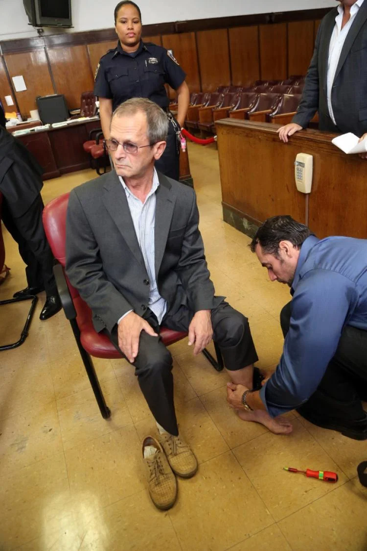 Bail bondsman Ira Judelson and monitoring agent Emanuel Scharon from Accurate Trace attached an electronic monitoring bracelet to Lehman's ankle as seen above in the picture before he was allowed to leave the courtroom. Judelson was put in charge of monitoring the elderly defendant.